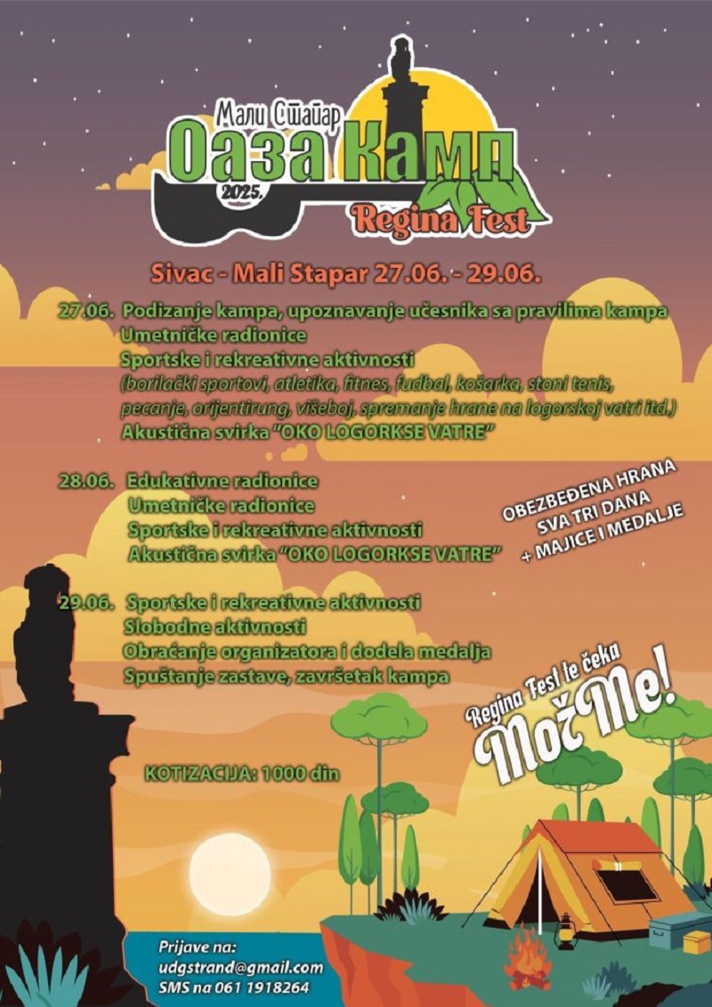 Камп за родитеље, децу и омладину, ,,Регина фест“, одржаће се на Малом Стапару од 27. до 29. јуна ове године. Кроз три дана учесници ће имати прилику да учествују у спортским и рекреативним активностима, борилачким спортовима, атлетици, фитнесу, фудбалу, кошарци, стоном тенису, пецању, вишебоју и спремању хране на логорској ватри, у уметничким и едукативним радионицама и свирци око логорске ватре.