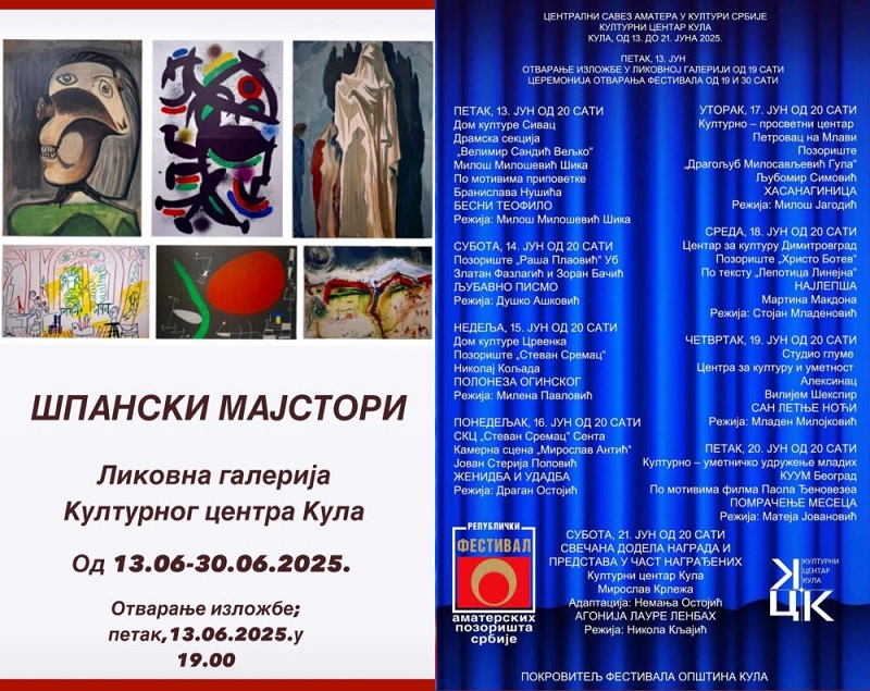 Вечерас у Кули почиње 66. Републички фестивал аматерских позоришта Србије. Отварању фестивала претходиће отварање изложбе под називом ,,Шпански мајстори“, која је заказана за 19 часова. Изложбу ,,Шпански мајстори“ чини тридесет графичких радова различитих графичких техника, тројице светских сликара: Пабла Пикаса, Хуана Мироа и Салвадора Далија. Све графике су из приватних колекција.