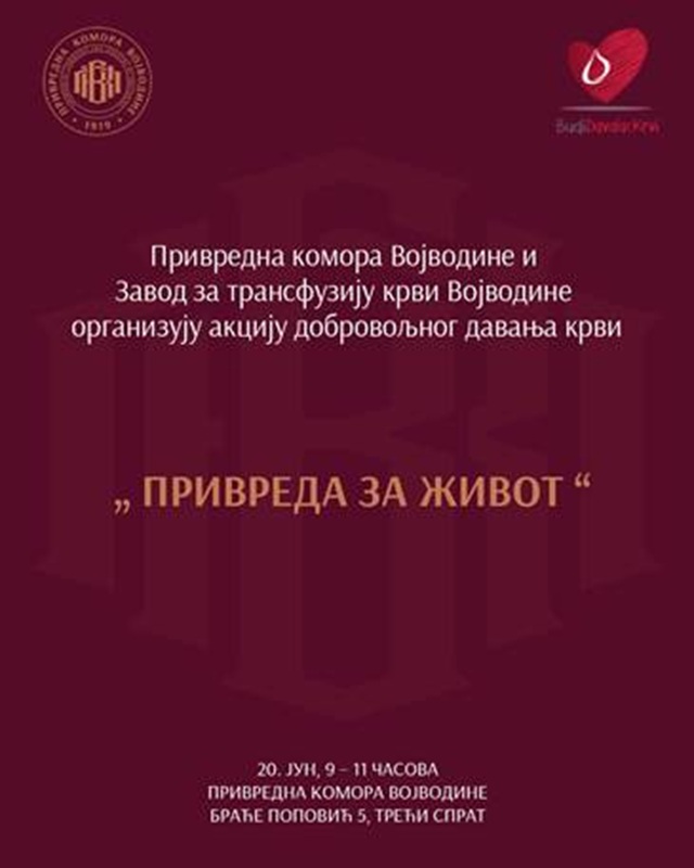 Привредна комора Војводине и Завод за трансфузију крви Војводине организују акцију добровољног давања крви у петак 20 јуна од 9- 11 часова у Великој сали Привредне коморе Војводине.