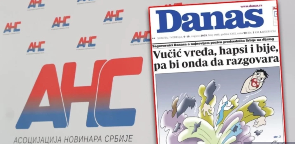 Асоцијација новинара Србије најоштрије осуђује срамотну насловну страну листа „Данас“, на којој је председник Александар Вучић приказан раскомадан у експлозији бомбе.