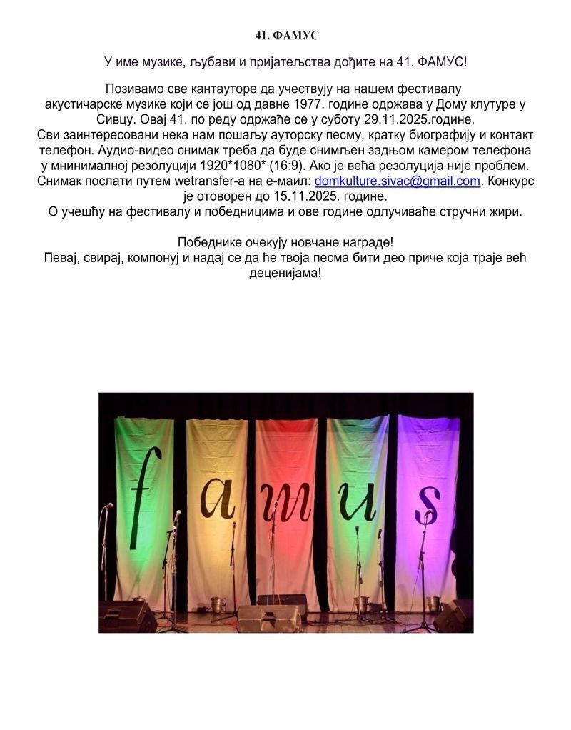 - Фестивал акустичарске музике у Сивцу (,,ФАМУС“) биће одржан у суботу, 29. новембра, а пријаве на конкурс за учешће трајаће до 15. новембра.