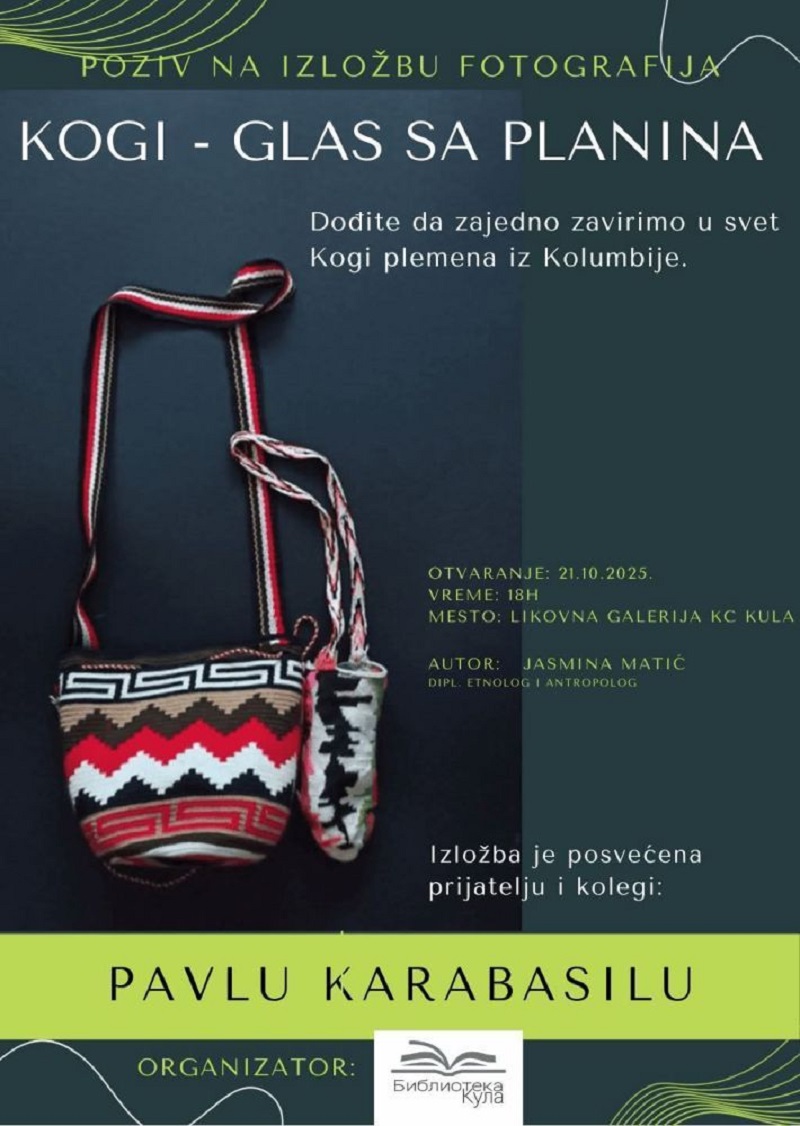 Народна библиотека Кула организује изложбу фотографија народа Коги из Колумбије, која открива њихову блискост с природом и живот у складу с Мајком Земљом. Аутор изложбе је дипломирани етнолог и антрополог Јасмина Матић, а отварање је у уторак, 21. октобра са почетком у 18 часова.