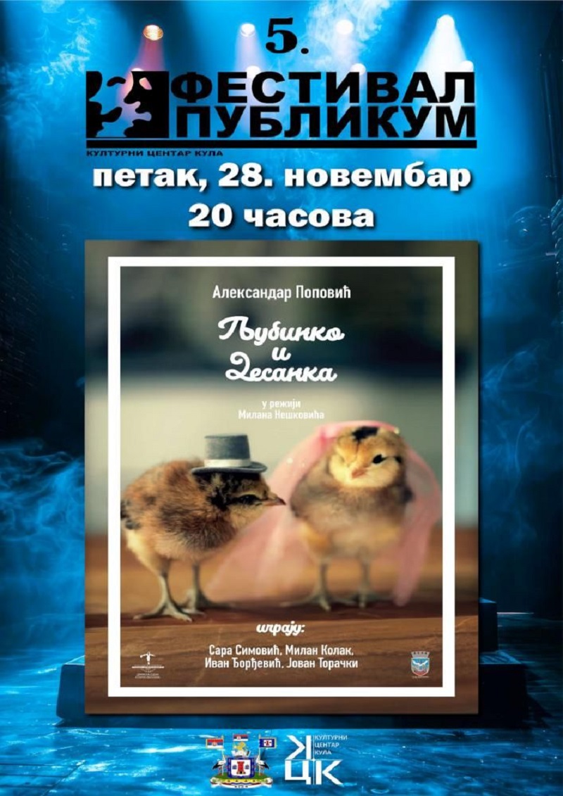 Вечерас, четврте фестивалске вечери, биће изведена представа ,,Љубинко и Десанка“, по тексту Александра Поповића, у режији Милана Нешковића, а у извођењу Народног позоришта ,,Тоша Јовановић“ из Зрењанина. Ко су Љубинко и Десанка, Август и Шпијалтер? Пробијајући се кроз вртоглаву сценску игру, разгрћући фарсу и дешифрујући давно заборављене локације, занате и изразе, ишчекујући заједно са њима на једној клупи у парку, по киши, открили смо усамљеност, велику као океан, бескрајну потребу за другим бићем, за блискошћу и пријатељством, вапај да неко потврди наше постојање. И док покушавамо да попунимо време које нам је на овој земљи дато, мали, често наизглед бесмислени разговори, топао људски додир, слушалац, саговорник и сапутник учиниће да што безболније проживимо и преживимо живот.