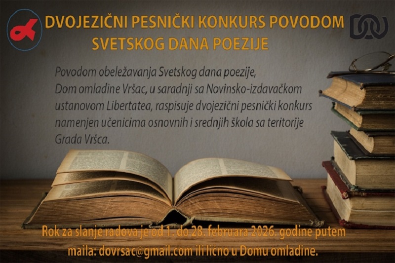 Поводом обележавања Светског дана поезије, Дом омладине Вршац, у сарадњи са Новинско-издавачком установом „Libertatea“, расписао је двојезични песнички конкурс намењен ученицима основних и средњих школа са територије Града Вршца.