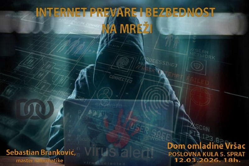 Дом омладине Вршац организује едукативно предавање на тему „Интернет преваре и безбедност на мрежи“, које ће бити одржано у четвртак, 12. марта, са почетком у 18 часова, на 5. спрату Пословне куле Millennium.