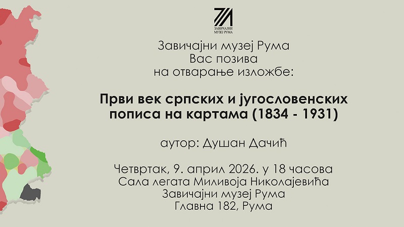 Отварање изложбе „Први век српских и југословенских пописа на картама (1834–1931)“, аутора Душана Дачића биће одржано у четвртак 9. априла, у 18 часова у Сали легата Миливоја Николајевића.